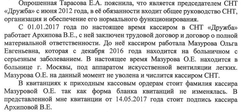 Из Постановления полиции мы узнали еще кое-что интересное. В заявлении садоводов было указано, что, несмотря на решение суда, из которого следует, что членские взносы не были повышены, а остались в размере 917 руб. за сотку, кассир и председатель правления продолжают получать с садоводов повышенные взносы в 1400 руб. за сотку. На это Тарасова Е.А. дала такое объяснение: