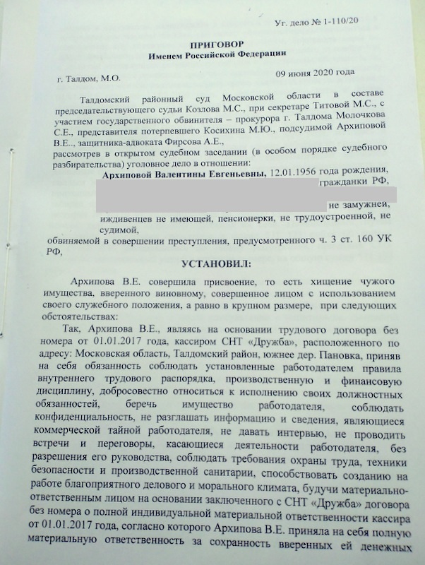 Прежде всего, необходимо сообщить садоводам, что в последнюю неделю перед судом по уголовному делу № 1-110/2020 Архипова возместила почти весь материальный ущерб, который был нанесён ею товариществу, вернула почти все украденные ею (якобы только ею) деньги.