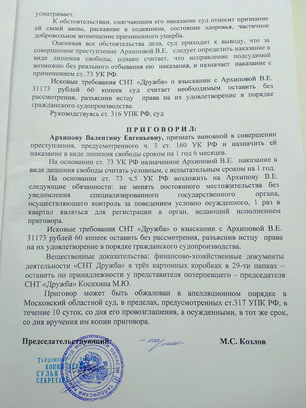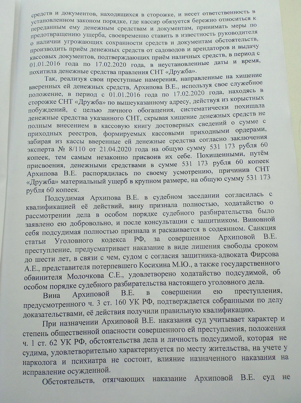 Архиповой ещё повезло, что по минимуму приговорили и условно, а Тарасовой повезло, что в этой ситуации она пока в стороне, так как материальную ответственность за приходно кассовые ордера несла кассир Архипова, хорошая подстава своей подруги, хотя все трое варились в одной каше Тарасова, Архипова, Куликова. Членские взносы не платить, хорошо устроились, а за электроэнергию таже Тарасова, Архипова и т. д. из их группировки, когда последний раз платили и за какой период, думаю, что врятли они платят. Хорошо устроились живя в СНТ за чужой счёт.